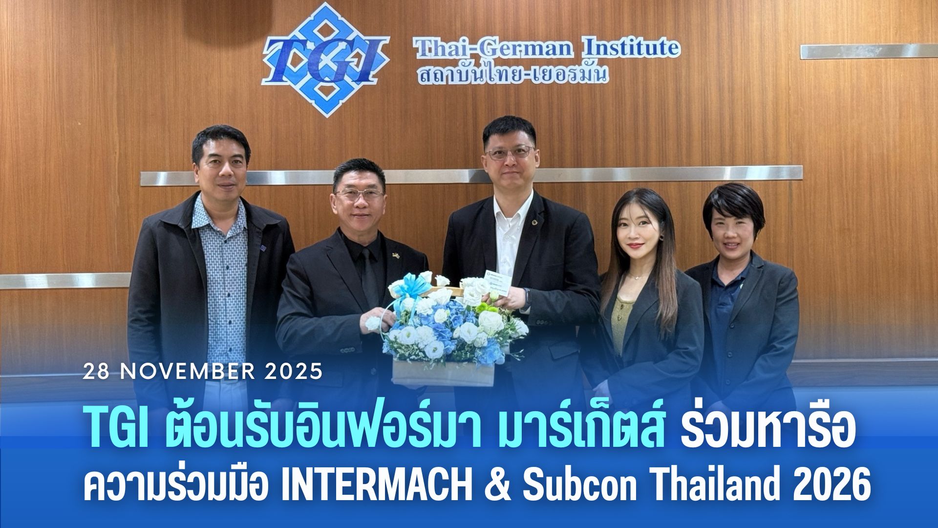 นายปรัชญา อินทรานุปกรณ์ ผู้อำนวยการสถาบันไทย–เยอรมัน (TGI) และนายธีระพนธ์ ศรนิล ผู้จัดการอาวุโส ให้การต้อนรับนายเมธาวัจน์ เศรษฐจินดาเจริญ รองผู้อำนวยการฝ่ายบริหารโครงการ และทีมงานบริษัท อินฟอร์มา มาร์เก็ตส์ (ประเทศไทย) ผู้จัดงาน INTERMACH and Subcon Thailand 2569 ในโอกาสเข้าแสดงความยินดีต่อการเข้ารับตำแหน่งผู้อำนวยการฯ รวมถึงได้หารือแลกเปลี่ยนมุมมองและแนวทางความร่วมมือในการจัดกิจกรรมของสถาบันฯ ภายในงาน “INTERMACH and Subcon Thailand 2569” ซึ่งมีกำหนดจัดขึ้นระหว่างวันที่ 13–16 พฤษภาคม 2569 ณ ศูนย์นิทรรศการและการประชุมไบเทค บางนา