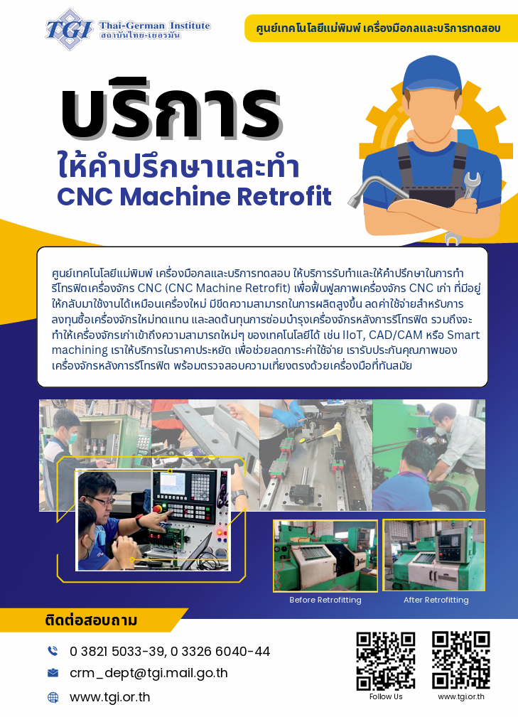ให้บริการรับทำและให้คำปรึกษาในการทำรีโทรฟิตเครื่องจักร CNC (CNC machine retrofit) เพื่อฟื้นฟูสภาพเครื่องจักร CNC เก่าที่มีอยู่ ให้กลับมาใช้งานได้เหมือนเครื่องใหม่ มีขีดความสามารถในการผลิตสูงขึ้น ลดค่าใช้จ่ายสำหรับการลงทุนซื้อเครื่องจักรใหม่ทดแทน และลดต้นทุนการซ่อมบำรุงเครื่องจักรหลังการรีโทรฟิต รวมถึงจะทำให้เครื่องจักรเก่าเข้าถึงความสามารถใหม่ๆ ของเทคโนโลยีได้ เช่น IIoT, CAD/CAM หรือ Smart machining เราให้บริการในราคาประหยัด เพื่อช่วยลดภาระค่าใช้จ่าย เรารับประกันคุณภาพของเครื่องจักรหลังการรีโทรฟิต พร้อมตรวจสอบความเที่ยงตรงด้วยเครื่องมือที่ทันสมัย