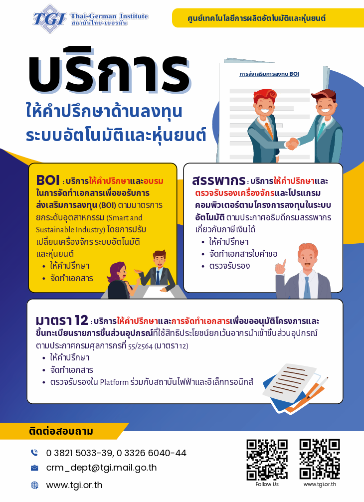 บริการให้คำปรึกษาและอบรมในการจัดทำเอกสารเพื่อขอรับการส่งเสริมการลงทุน (BOI) ตามมาตรการยกระดับอุตสาหกรรม (Smart and Sustainable Industry) โดยการปรับเปลี่ยนเครื่องจักร ระบบอัตโนมัติ และหุ่นยนต์