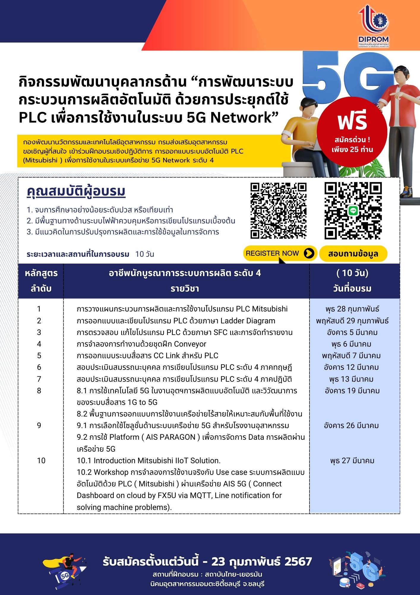 ขอเชิญผู้ที่สนใจ เข้าร่วมฝึกอบรมเชิงปฏิบัติการ การออกแบบระบบอัตโนมัติ PLC (Mitsubishi ) เพื่อการใช้งานในระบบเครือข่าย 5G Network ระดับ 4