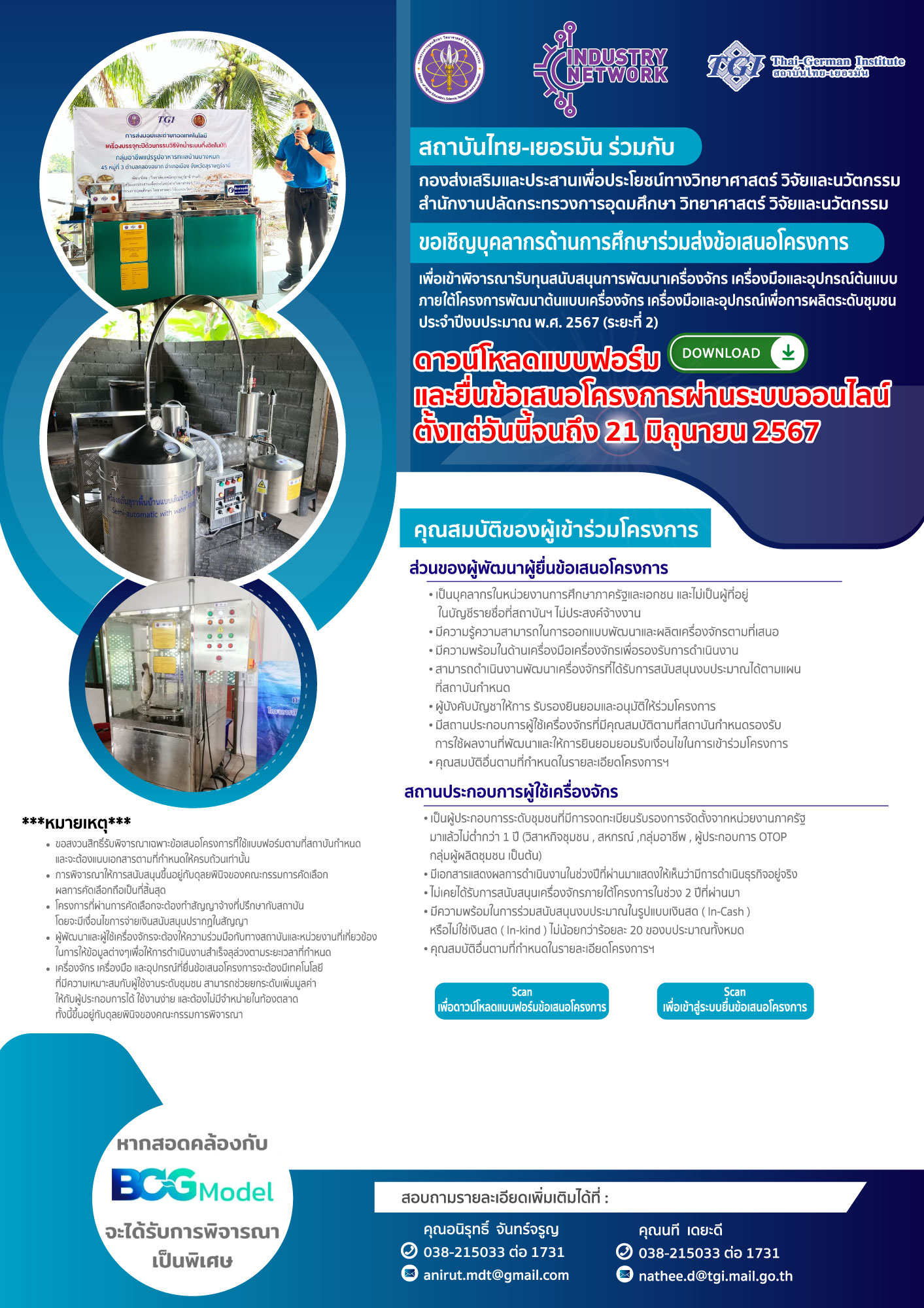 สถาบันไทย-เยอรมัน ร่วมกับ กองส่งเสริมเพื่อประโยชน์ทางวิทยาศาสตร์ วิจัยและนวัตกรรม ขอเชิญบุคลากรด้านการศึกษาทั้งภาครัฐและเอกชน ร่วมส่งข้อเสนอโครงการเพื่อเข้ารับการพิจารณาให้ทุนสนับสนุนในการพัฒนาเครื่องจักร เครื่องมือและอุปกรณ์ ภายใต้โครงการพัฒนาต้นแบบเครื่องจักรเครื่องมือและอุปกรณ์เพื่อการผลิตระดับชุมชนประจำปีงบประมาณพ.ศ 2567 ระยะที่ 2 ผู้สนใจสามารถดาวน์โหลดแบบฟอร์มข้อเสนอโครงการและยื่นข้อเสนอโครงการผ่านระบบออนไลน์โดยสแกนคิวอาร์โค้ดด้านล่าง เปิดรับข้อเสนอโครงการตั้งแต่บัดนี้จนถึงวันที่ 21 มิถุนายน 2567