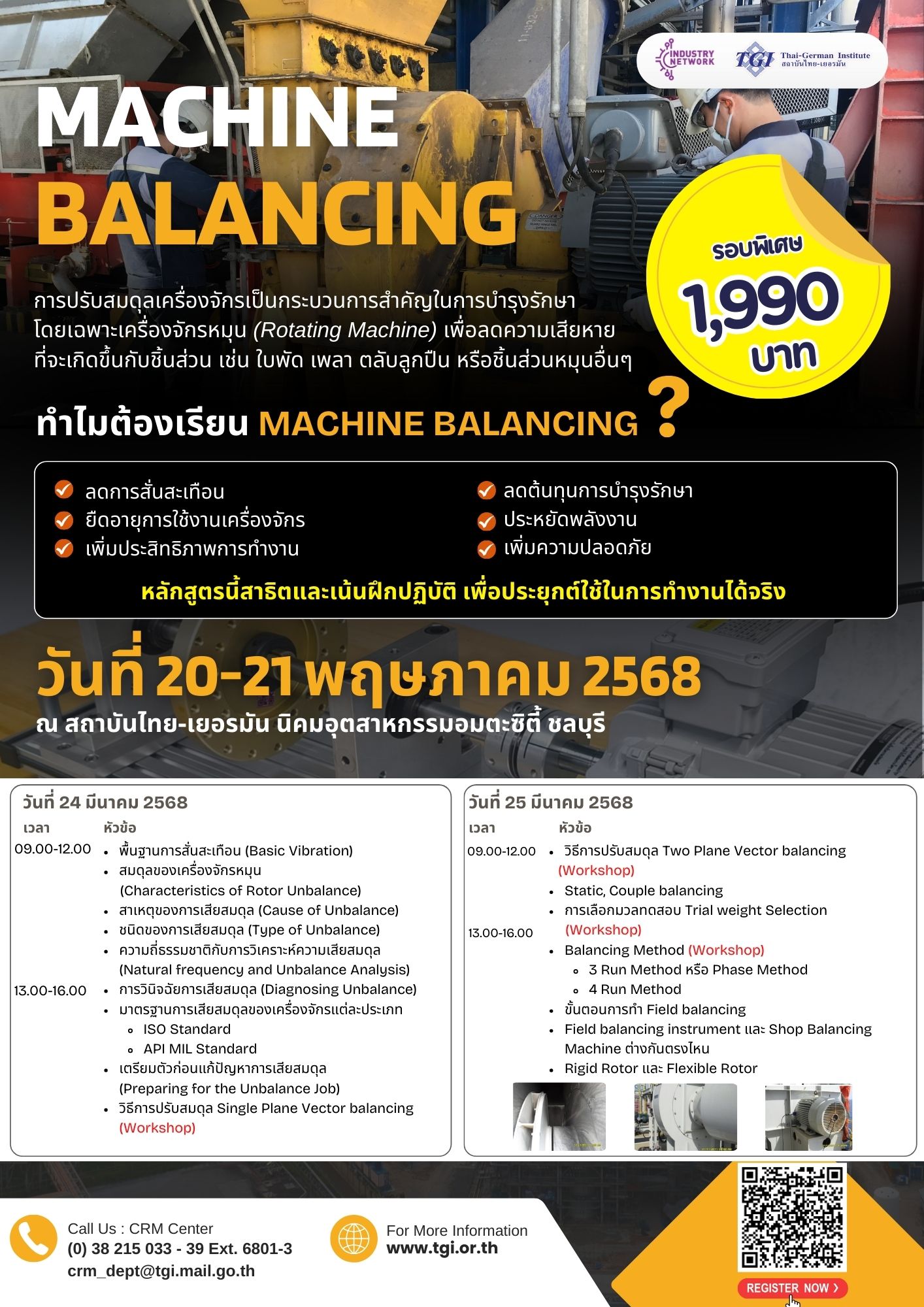 สถาบันไทย-เยอรมัน เปิดหลักสูตรอบรม Machine Balancing (รอบพิเศษ) สำหรับวิศวกร ช่างเทคนิค และบุคลากรในภาคอุตสาหกรรม ที่ต้องการเพิ่มพูนความรู้และทักษะด้านการปรับสมดุลเครื่องจักร ลดปัญหาการสั่นสะเทือน และยืดอายุการใช้งานของอุปกรณ์