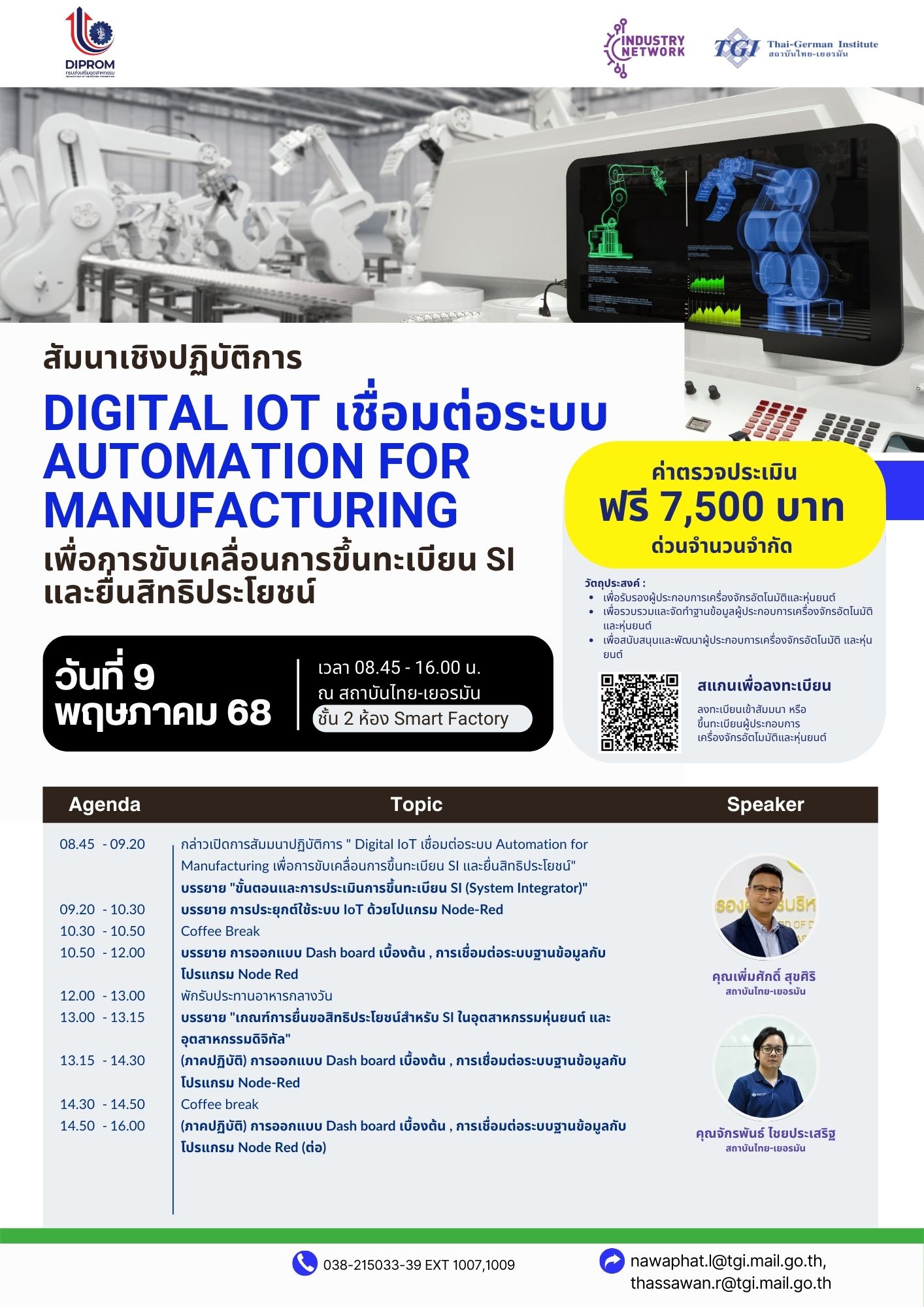 สถาบันไทย-เยอรมัน ร่วมกับกรมส่งเสริมอุตสาหกรรม ขอเชิญผู้ประกอบการ วิศวกร นักพัฒนาเทคโนโลยี และผู้สนใจ เข้าร่วม สัมมนาเชิงปฏิบัติการ Digital IoT เชื่อมต่อระบบ Automation for Manufacturing ซึ่งจัดขึ้นเพื่อสนับสนุนการขึ้นทะเบียนเป็น System Integrator (SI) และยื่นขอรับสิทธิประโยชน์ตามนโยบายส่งเสริมอุตสาหกรรม