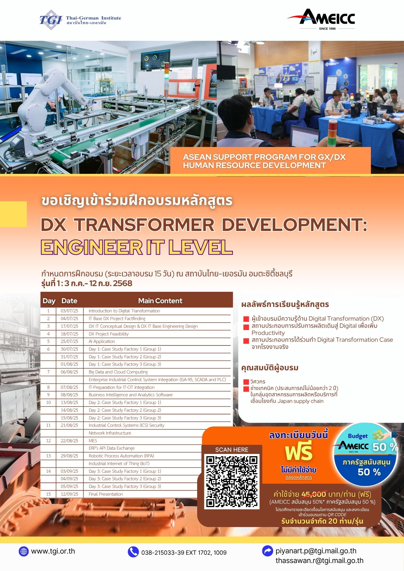 สำหรับผู้ที่ทำงานในสายงานเทคโนโลยีสารสนเทศ วิศวกรรมซอฟต์แวร์ หรือวิเคราะห์ข้อมูล สถาบันไทย-เยอรมัน (TGI) เปิดรับสมัครอบรมในหลักสูตร DX Transformer Development: Engineer IT Level เพื่อพัฒนาทักษะในการประยุกต์ใช้เทคโนโลยีดิจิทัลในการบริหารจัดการข้อมูล การวางระบบ และการวิเคราะห์เชิงลึกในองค์กรภาคอุตสาหกรรม