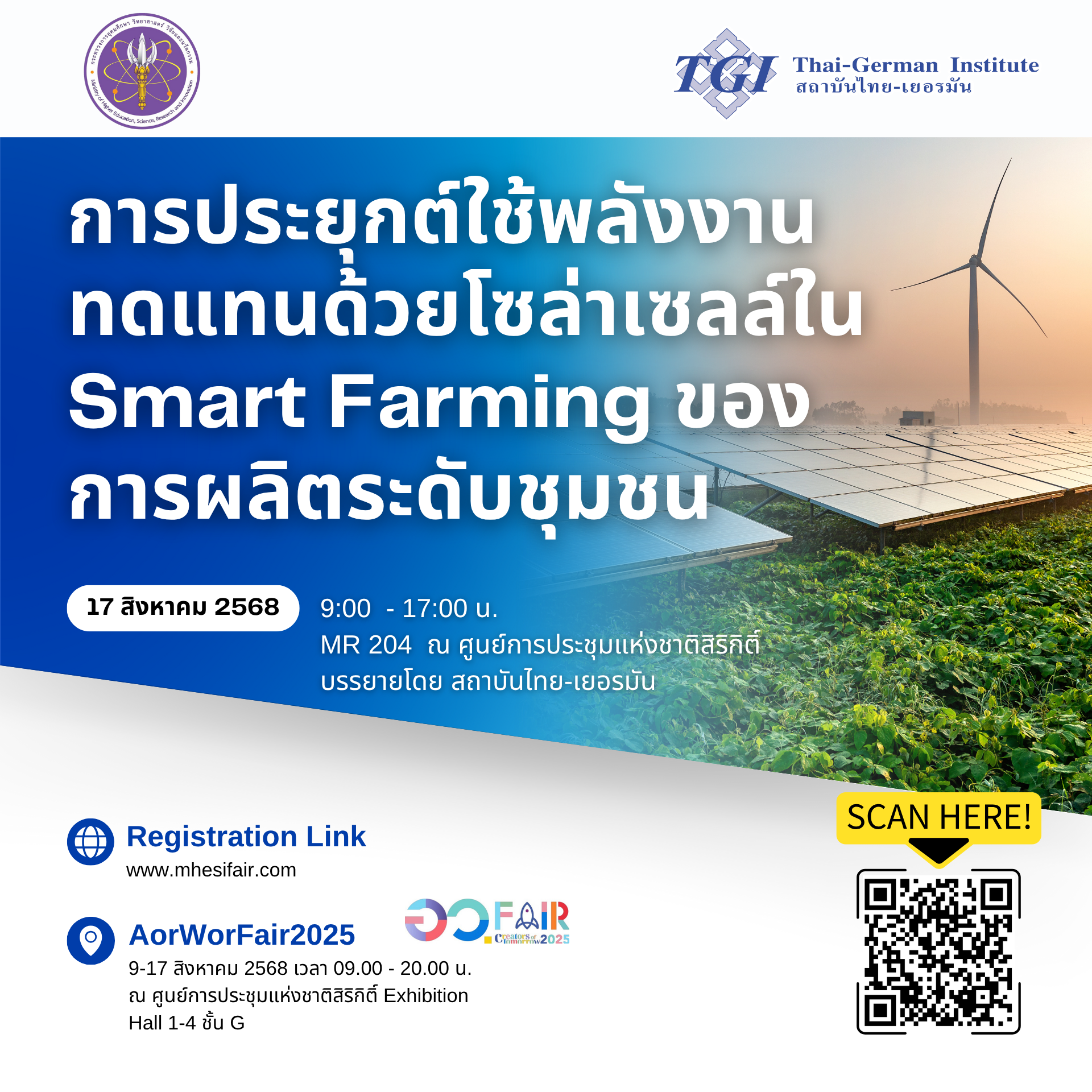 สถาบันไทย-เยอรมัน ขอเชิญผู้ประกอบการ นักพัฒนาเทคโนโลยี หน่วยงานภาครัฐ รวมถึงผู้ที่สนใจ ร่วมฟังสัมมนาในงาน อว.แฟร์ 2025 (MHESI FAIR 2025) ภายใต้แนวคิด “Creators of Tomorrow” ซึ่งจะจัดขึ้นระหว่างวันที่ 9 – 17 สิงหาคม 2568ศูนย์การประชุมแห่งชาติสิริกิติ์ (Exhibition Hall 1–4 ชั้น G)