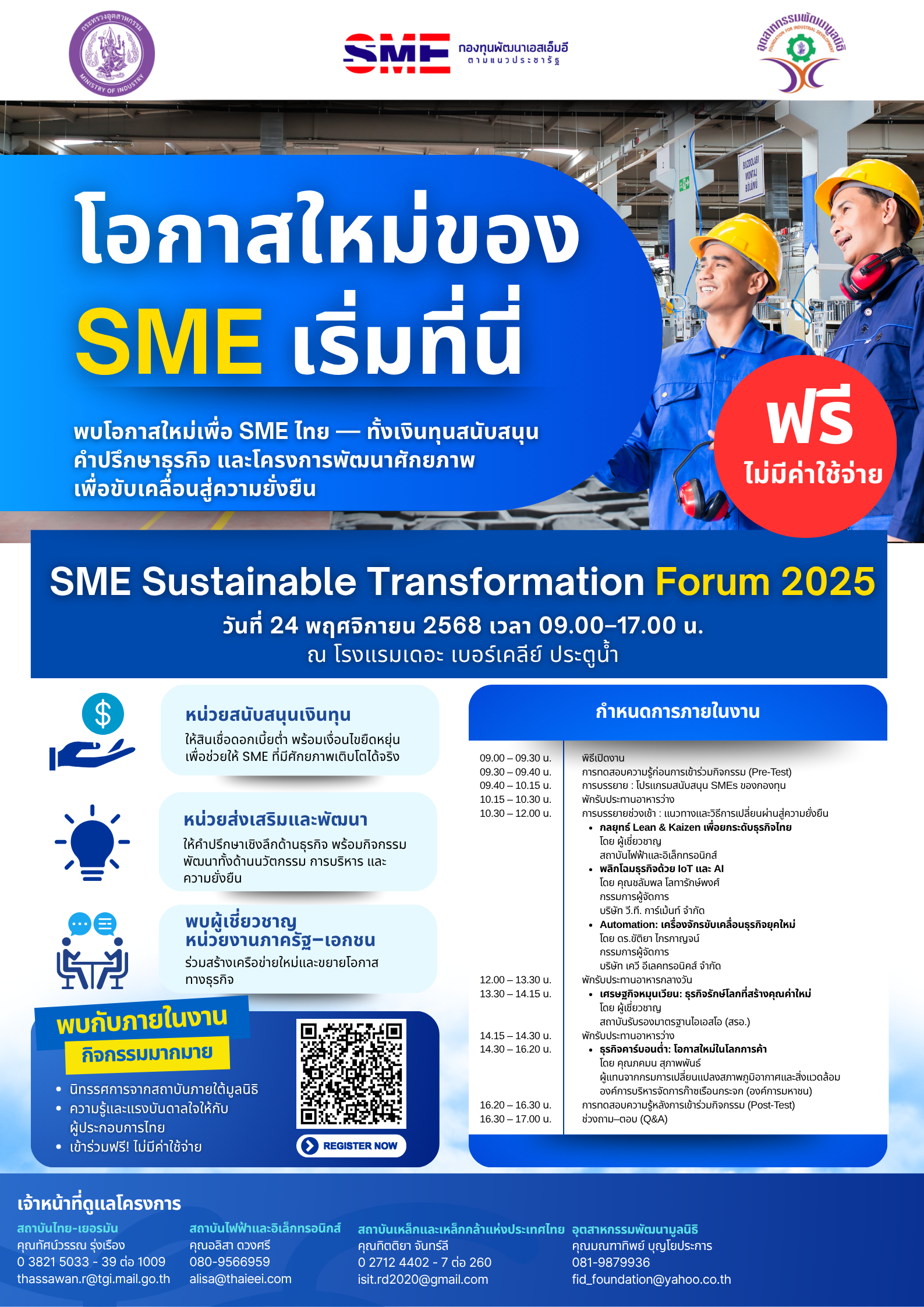 สถาบันไทย-เยอรมัน ขอเชิญผู้ประกอบการ SME เข้าร่วมงานสัมมนา “SME Sustainable Transformation Forum 2025” เพื่อเปิดโอกาสให้ผู้ประกอบการไทยได้เข้าถึงแหล่งเงินทุนสนับสนุน คำปรึกษาทางธุรกิจ และโครงการพัฒนาศักยภาพ เพื่อขับเคลื่อนสู่ความยั่งยืนของภาคอุตสาหกรรม