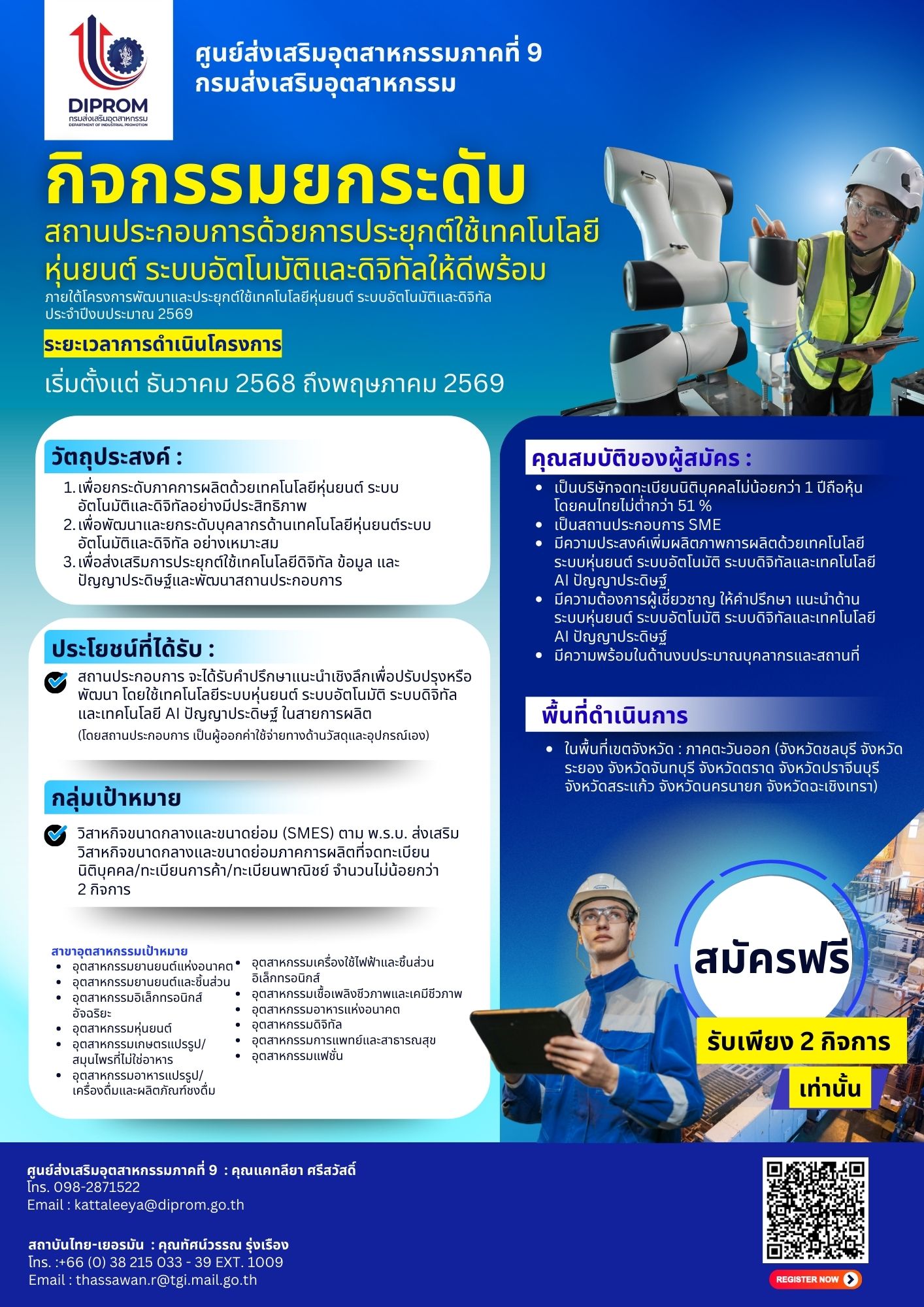 กรมส่งเสริมอุตสาหกรรม (DIPROM) โดยศูนย์ส่งเสริมอุตสาหกรรมภาคที่ 9 เปิดรับสมัครสถานประกอบการเข้าร่วม กิจกรรมยกระดับสถานประกอบการด้วยการประยุกต์ใช้เทคโนโลยีหุ่นยนต์ ระบบอัตโนมัติ และดิจิทัล ภายใต้โครงการพัฒนาและประยุกต์ใช้เทคโนโลยีหุ่นยนต์ ระบบอัตโนมัติ และดิจิทัล ประจำปีงบประมาณ พ.ศ. 2569 เพื่อส่งเสริมและเพิ่มประสิทธิภาพกระบวนการผลิตของสถานประกอบการภาคอุตสาหกรรมไทย