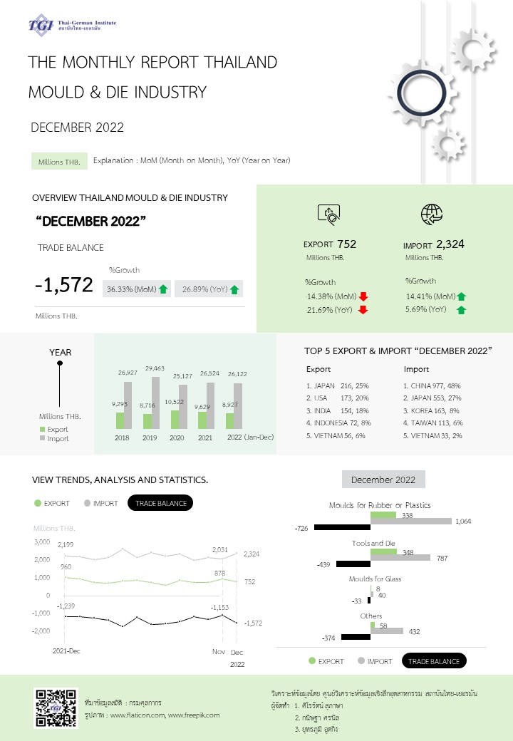 ในเดือนธันวาคม ปี 2565 นี้ ประเทศไทยขาดดุลการค้าในกลุ่มอุตสหกรรมแม่พิมพ์ อยู่ที่ -1,572 ล้านบาท เพิ่มสูงขึ้นเมื่อเทียบกับระยะเวลาเดียวกันในปีก่อน และเดือนก่อนหน้า คิดเป็นร้อยละ 26.89 และร้อยละ 36.33 ตามลำดับ การส่งออกในเดือนนี้มีมูลค่าการส่งออกอยู่ที่ 752 ล้านบาท ชะลอตัวลดลงจากช่วงเวลาเดียวกันในปีก่อน และเดือนก่อนหน้า คิดเป็นร้อยละ -21.69 และ -14.38 ตามลำดับ โดยส่วนใหญ่ร้อยละ 45 ส่งออกไปยังประเทศญี่ปุ่นและประเทศสหรัฐอเมริกา ขณะที่มูลค่าการนำเข้าในเดือนนี้อยู่ที่ 2,324 ล้านบาท ปรับตัวดีขึ้นจากช่วงเวลาเดียวกันในปีก่อน ร้อยละ 14.41 โดยนำเข้าจากประเทศจีนและญี่ปุ่น คิดเป็นร้อยละ 75 ของการนำเข้าในเดือนนี้
